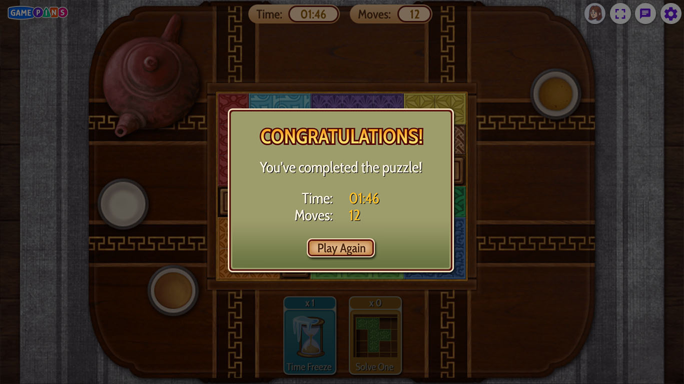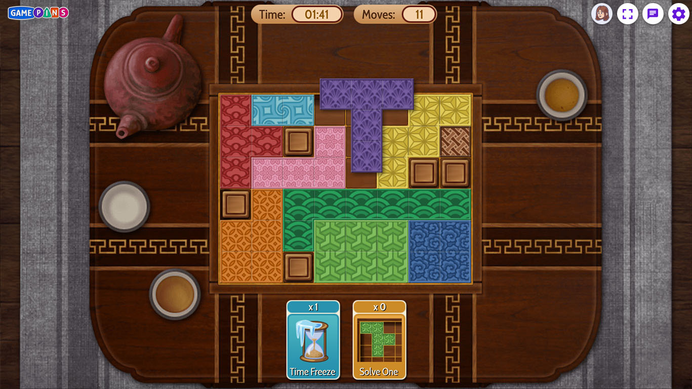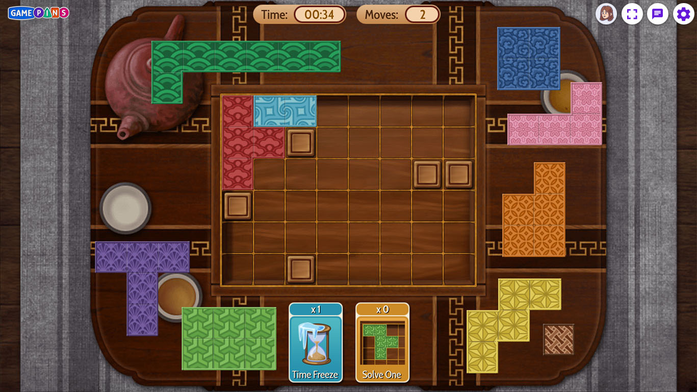 - If you want to solve the puzzle faster, you can use power-ups to freeze the timer or lock a single shape into the correct location.