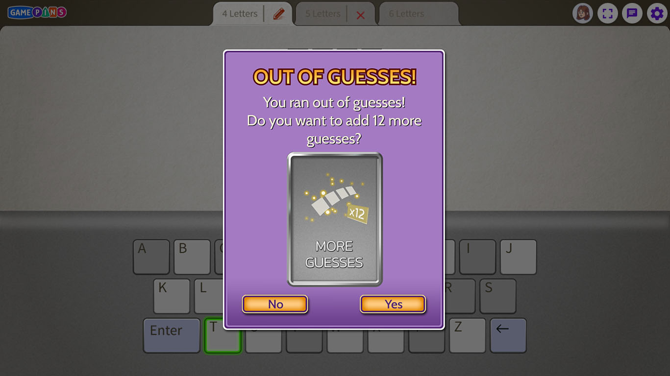 - If you run out of guesses, don't worry! Try the More Guesses power-up and give yourself a dozen extra chances to nail down the solution.